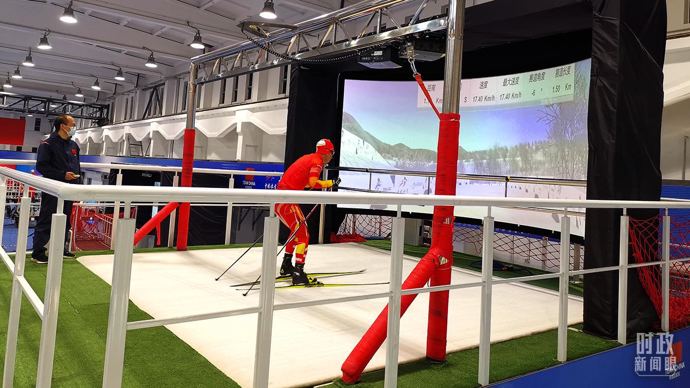 △六自由度一館的多功能訓(xùn)練系統(tǒng),適用滑雪專項(xiàng)訓(xùn)練。運(yùn)動員采用真實(shí)雪板和雪杖在沉浸式VR環(huán)境中訓(xùn)練,腳下的雪毯能模擬出雪上滑行的摩擦力感。(總臺央視記者楊立峰拍攝)