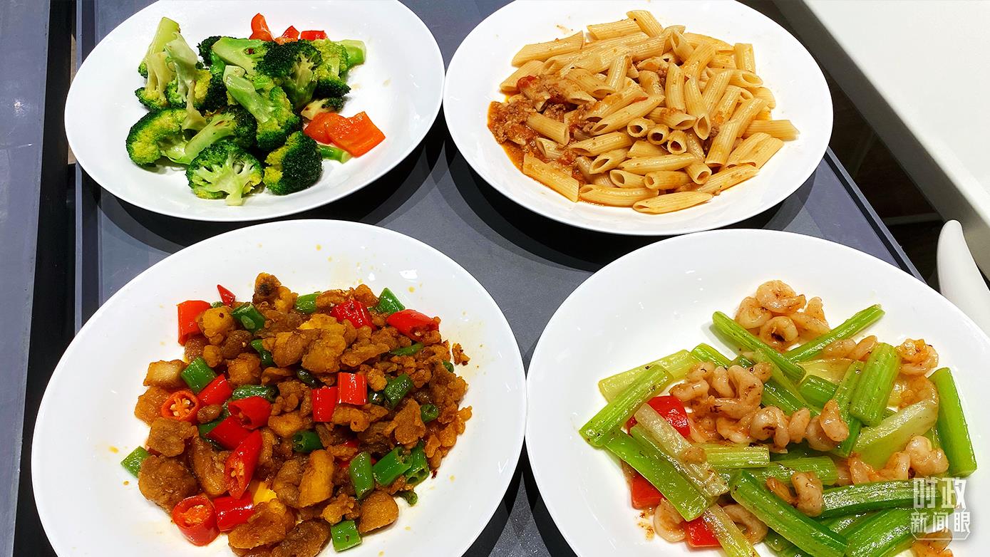 △當(dāng)天機(jī)器人餐廳制作的辣子雞丁、意面等四道美食。(總臺央視記者張宇拍攝)