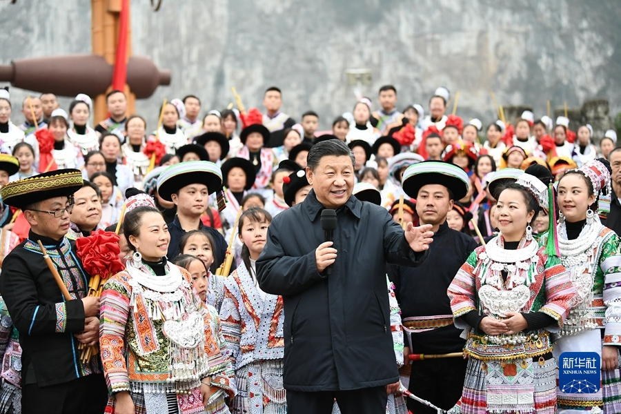2021年2月3日至5日,中共中央總書記、國家主席、中央軍委主席習近平來到貴州考察調研,看望慰問各族干部群眾,向全國各族人民致以美好的新春祝福。這是3日下午,習近平在畢節(jié)市黔西縣新仁苗族鄉(xiāng)化屋村文化廣場上,向全國各族人民、港澳臺同胞和海外僑胞拜年。