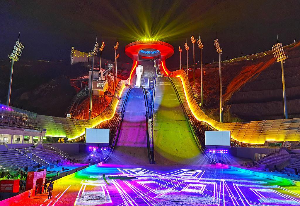 ▲國(guó)家跳臺(tái)滑雪中心“雪如意”燈光秀