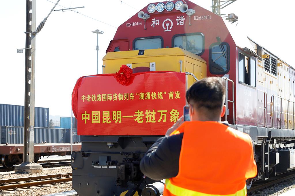 ▲2022年1月10日,中老鐵路時(shí)速120公里國(guó)際貨物列車“瀾湄快線”首發(fā)。
