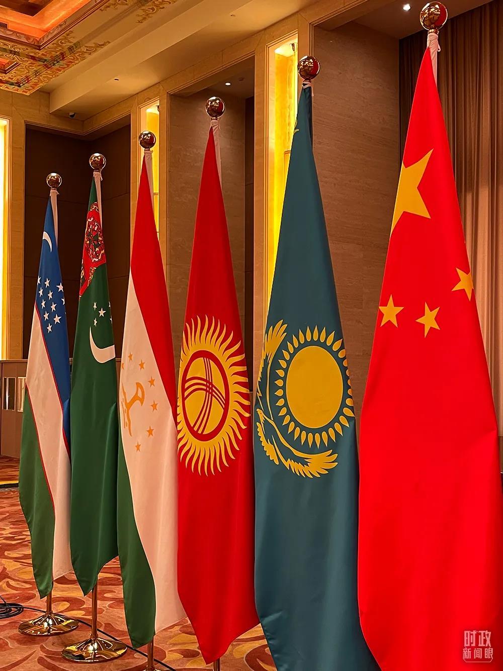 △會場擺放的中國與中亞五國國旗。(總臺央視記者趙化拍攝)