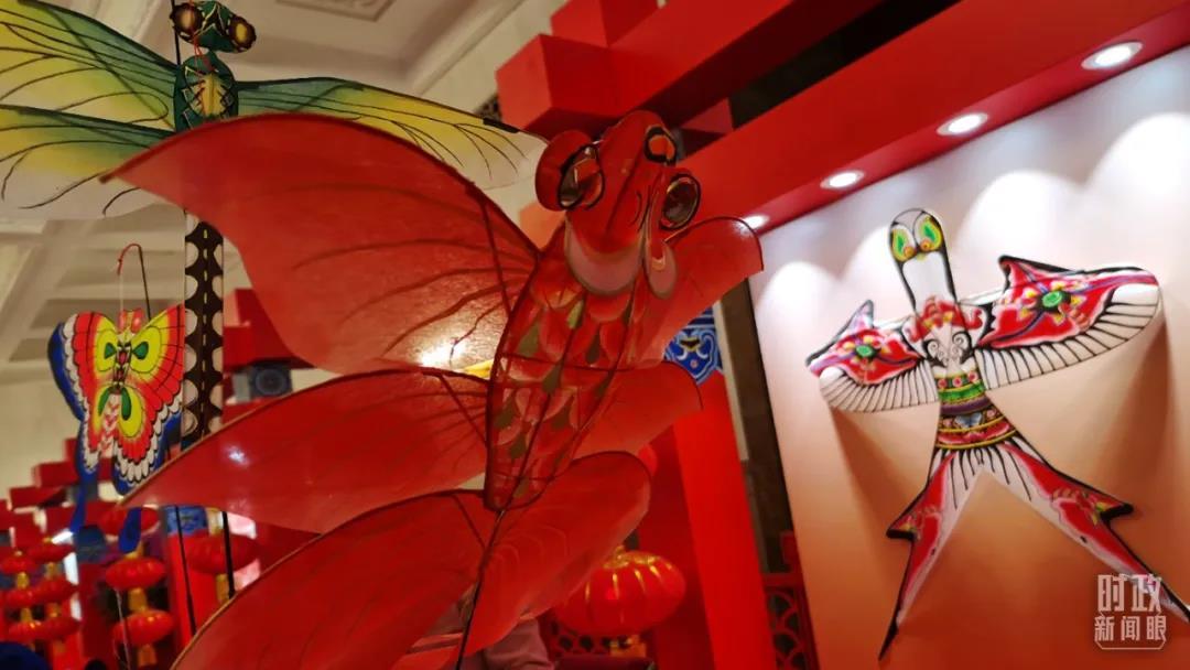 年畫、春聯(lián)、剪紙、風(fēng)箏、面塑、中國結(jié)、京劇臉譜、民樂合奏……這些從中國土地上長出來的非遺作品,匠心獨運、光彩照人,讓短短數(shù)十米的廊道化身為精華版的中國“廟會”。