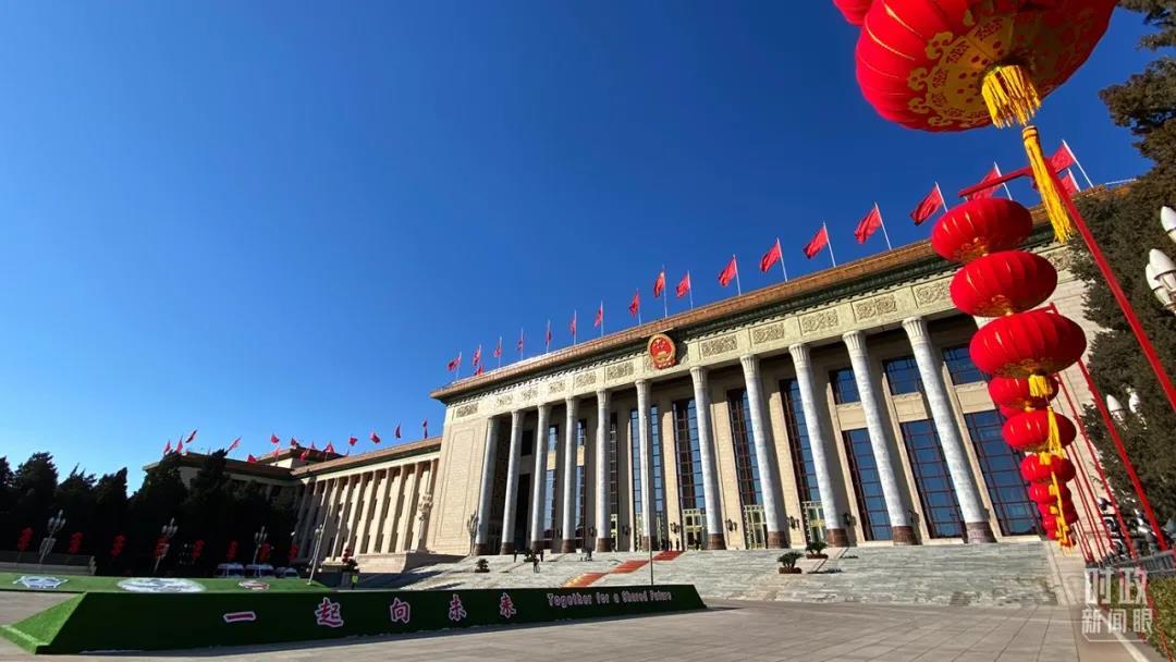 △人民大會堂外,為迎接冬奧新設(shè)計的“一起向未來”字樣格外醒目。(總臺央視記者石奇用拍攝)