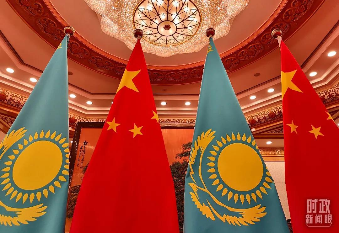 △2月5日上午,會談現(xiàn)場擺放的中哈兩國國旗。(總臺央視記者楊立峰拍攝)