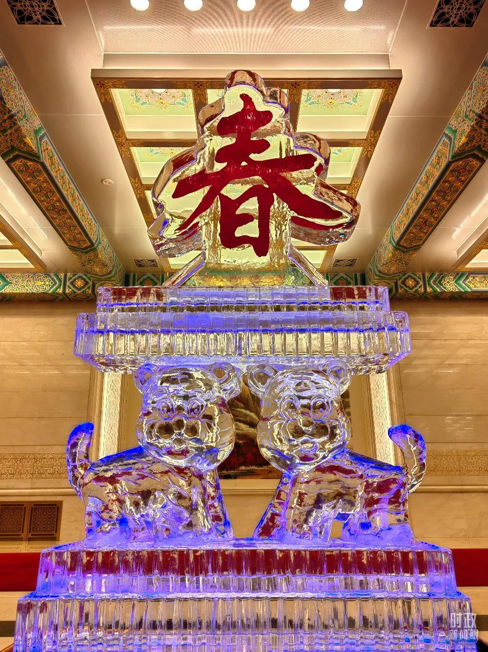 △宴會廳擺放的“春”主題冰雕。(總臺央視記者鐘鋒拍攝)