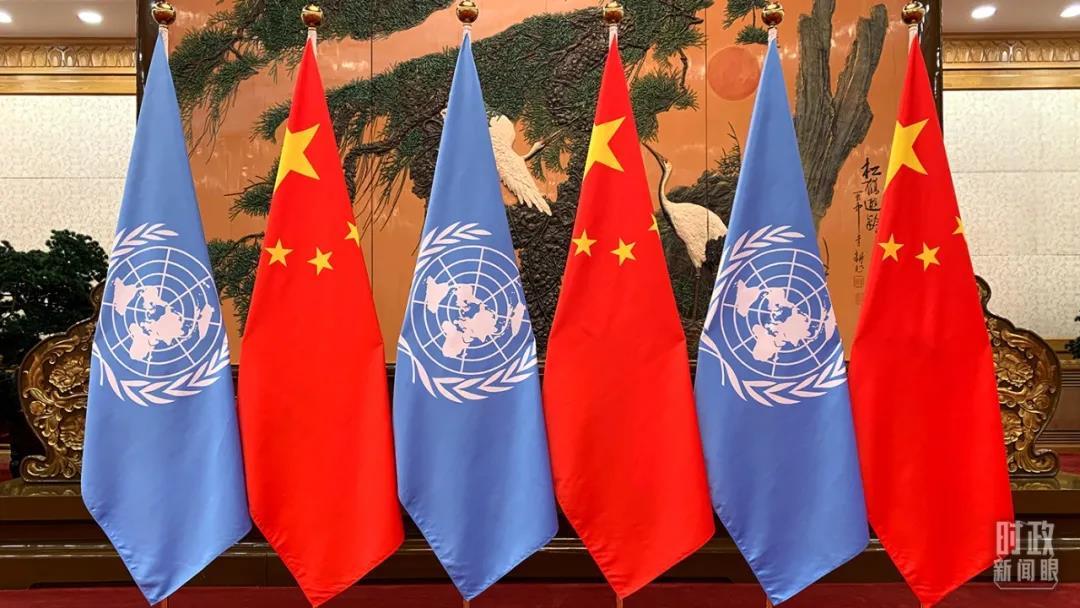 △會談現(xiàn)場的聯(lián)合國旗幟與五星紅旗。(總臺央視記者段德文拍攝)