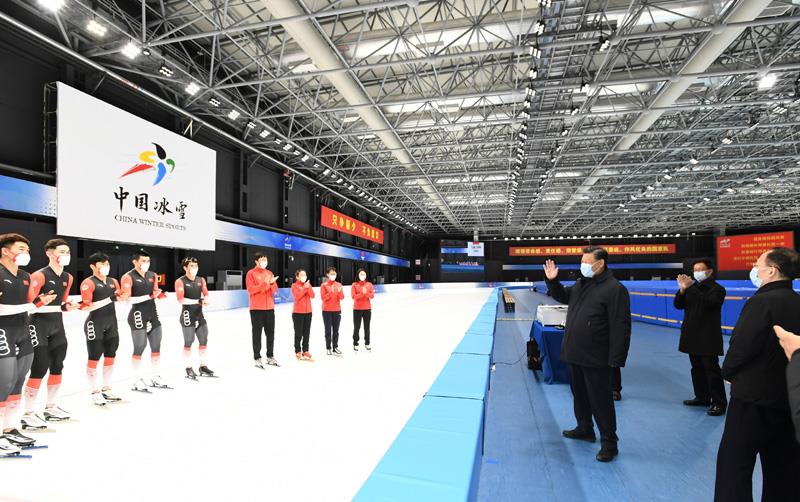 △ 2022年1月4日,習(xí)近平總書記在北京考察2022年冬奧會(huì)、冬殘奧會(huì)籌辦備賽工作。這是4日下午,總書記在二七廠冰雪項(xiàng)目訓(xùn)練基地速滑館,向參訓(xùn)運(yùn)動(dòng)員、教練員表示慰問(wèn)。