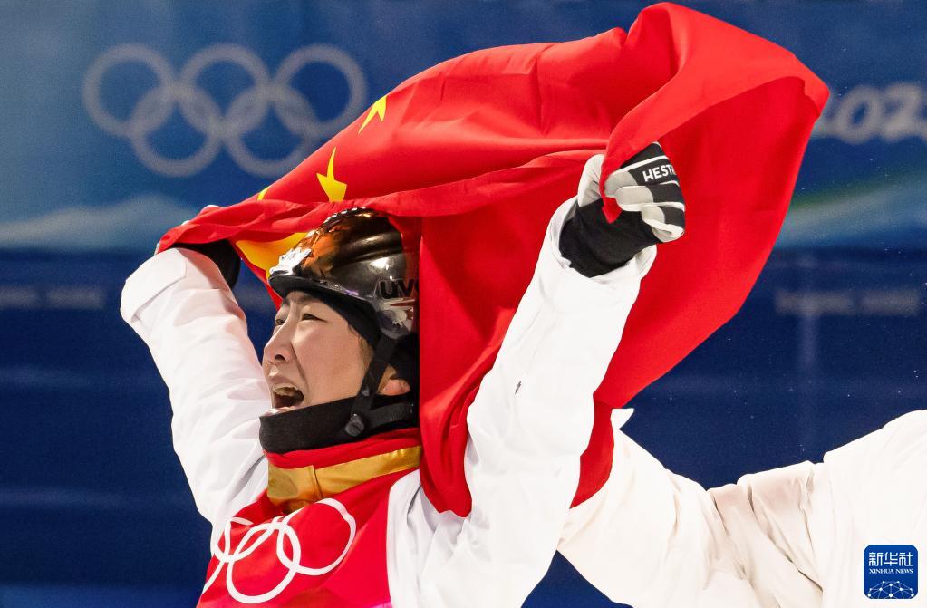 2月14日,中國選手徐夢(mèng)桃在比賽后慶祝。當(dāng)日,北京2022年冬奧會(huì)自由式滑雪女子空中技巧決賽在張家口云頂滑雪公園舉行,中國選手徐夢(mèng)桃奪得冠軍。新華社記者 肖藝九 攝