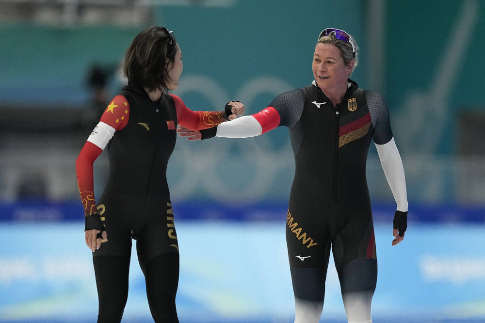 △比賽結(jié)束后,中國選手阿合娜爾向德國老將佩希施泰因表達(dá)敬意,佩希施泰因微笑著鼓勵阿合娜爾。
