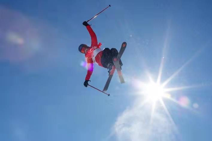 △北京冬奧會期間,藍(lán)天白云下,正在參加比賽的運(yùn)動員。