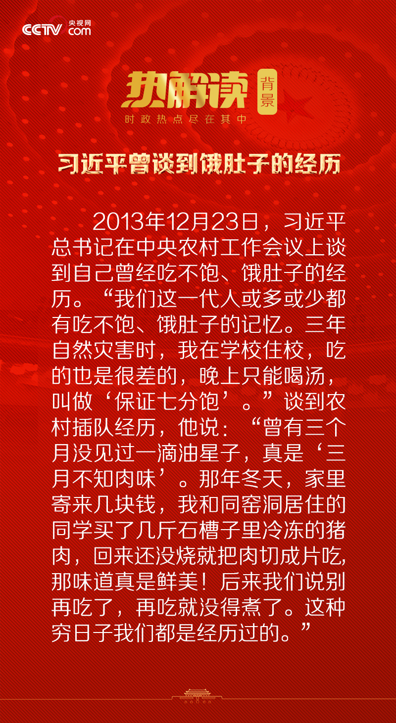 在本次聯(lián)組會上,總書記憶苦思甜,動情回憶以往勒緊褲腰帶的苦日子。這不是總書記第一次回憶“餓肚子”的苦日子,強(qiáng)調(diào)糧食安全的重要性。