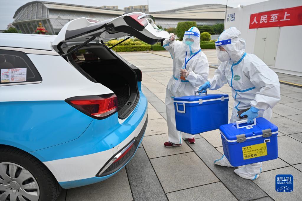3月24日,在福建泉州市海峽體育中心聯(lián)合方艙核酸檢測基地,參加“抗疫志愿車隊”的出租車司機(jī)(左)協(xié)助醫(yī)務(wù)人員裝運(yùn)核酸檢測樣本。新華社發(fā)(周義攝)