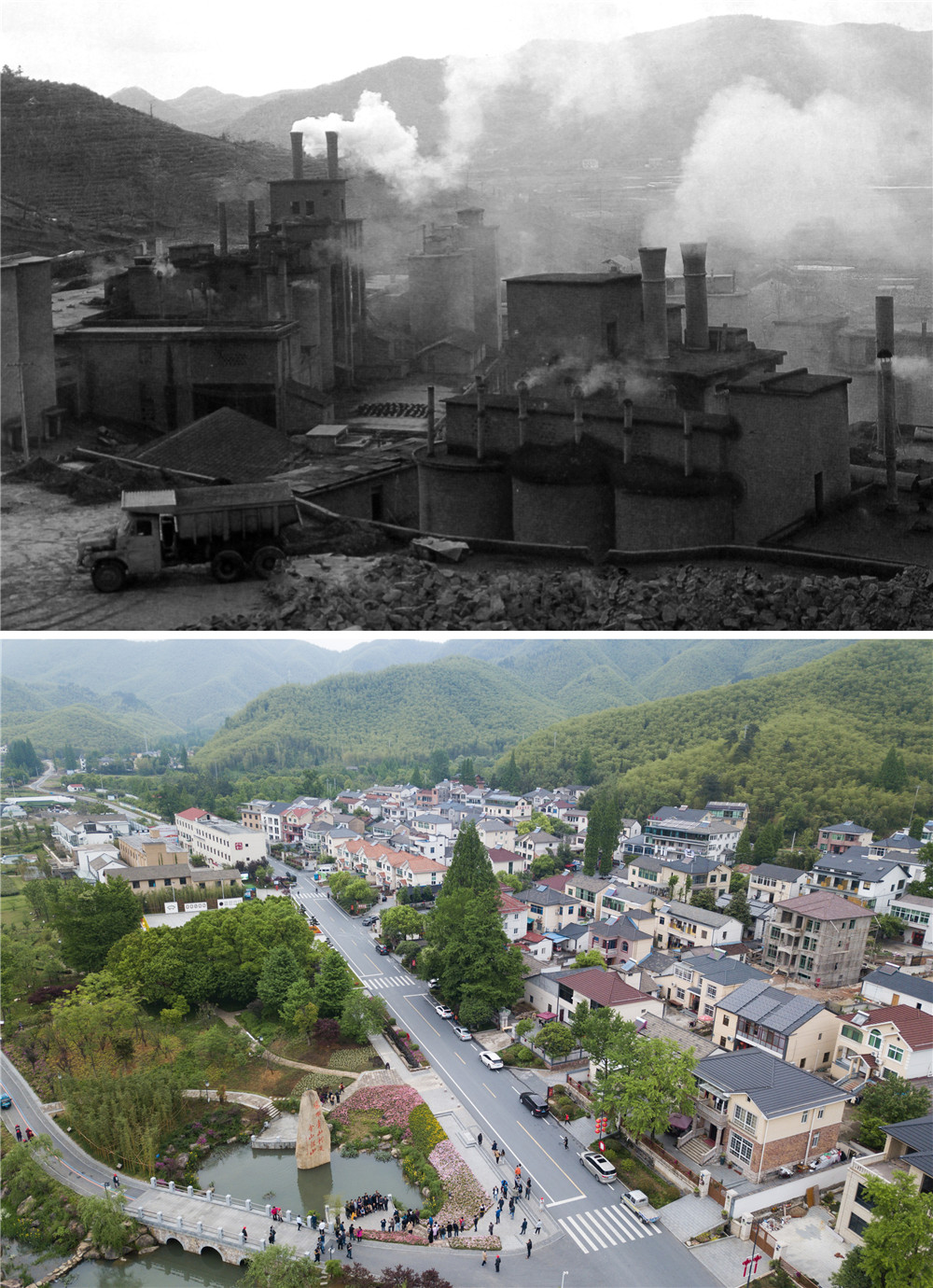 拼版照片:上圖為浙江省湖州市安吉縣天荒坪鎮(zhèn)余村二十世紀(jì)八十年代的資料照片;下圖為2018年4月24日,游客在整修一新的余村游覽(新華社記者翁忻旸攝)。新華社發(fā)