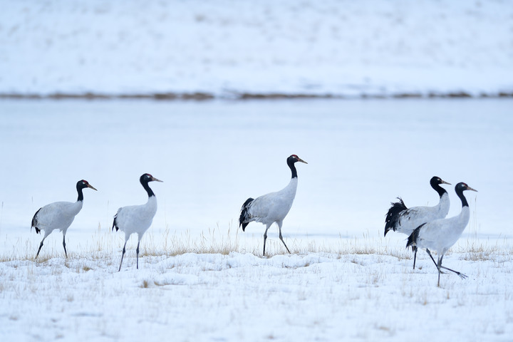 2021年10月21日在三江源國(guó)家公園黃河源園區(qū)內(nèi)拍攝的黑頸鶴。新華社記者 張龍 攝