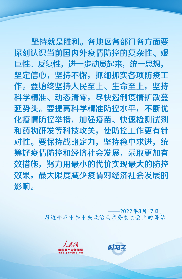“要始終堅(jiān)持人民至上、生命至上,堅(jiān)持科學(xué)精準(zhǔn)、動(dòng)態(tài)清零,盡快遏制疫情擴(kuò)散蔓延勢(shì)頭”。面對(duì)新冠肺炎疫情的跌宕反復(fù),習(xí)近平總書記親自指揮、親自部署,以科學(xué)之策應(yīng)對(duì)非常之難。今年以來,如何打好疫情防控和經(jīng)濟(jì)社會(huì)發(fā)展之戰(zhàn),習(xí)近平作出重要部署。