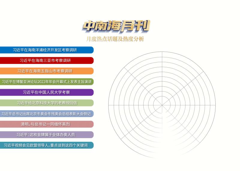 央視網“智聞”系統(tǒng)抓取2022年4月時政熱點新聞進行分析,習近平總書記在海南考察、在博鰲亞洲論壇2022年年會開幕式上發(fā)表主旨演講、在中國人民大學考察等話題熱度指數(shù)位居前列。