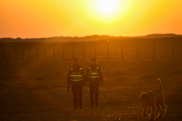 內(nèi)蒙古阿拉善邊境管理支隊銀根邊境派出所戍邊夫妻警務(wù)室的徐乃超和李文娜在邊境線附近巡邏(2022年4月18日攝)。新華社記者 彭源 攝