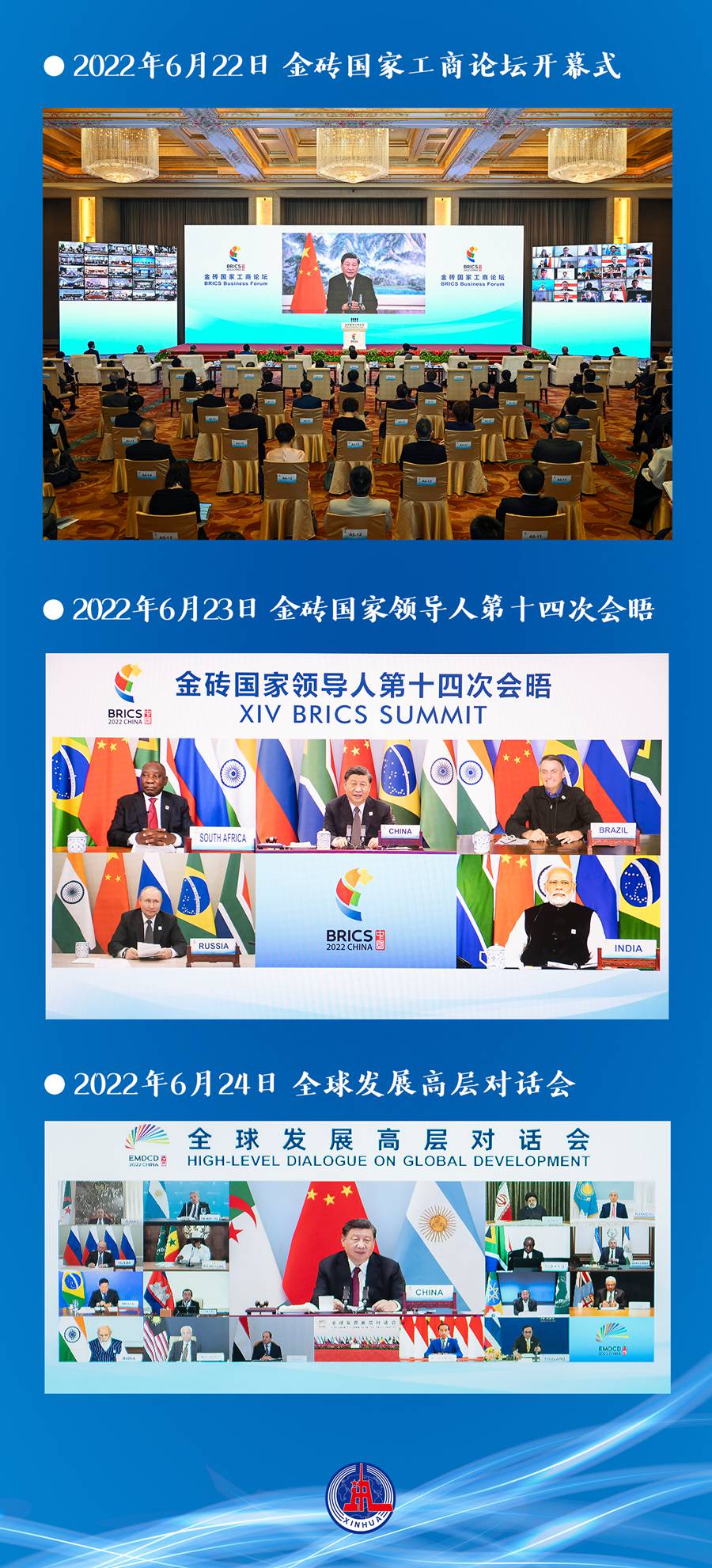 6月22日至24日,金磚“中國(guó)年”的高光時(shí)段,連續(xù)三個(gè)晚上,習(xí)近平主席以視頻方式相繼出席金磚國(guó)家工商論壇開(kāi)幕式,主持金磚國(guó)家領(lǐng)導(dǎo)人第十四次會(huì)晤、全球發(fā)展高層對(duì)話會(huì)。