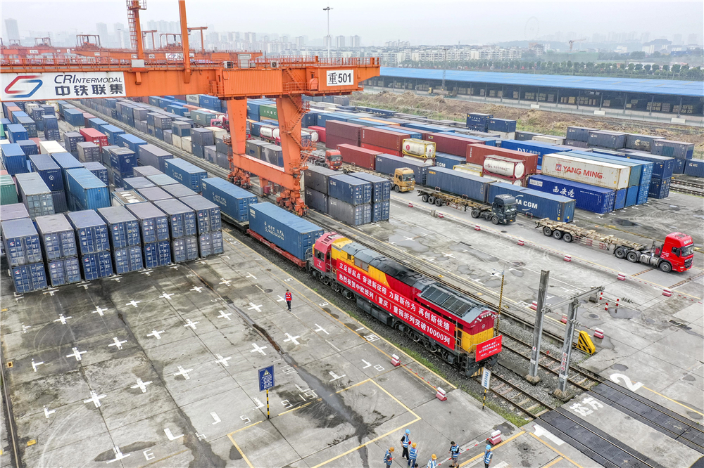 中歐班列(重慶)第10000列列車在重慶團(tuán)結(jié)村中心站等待發(fā)車(2022年6月23日攝,無人機(jī)照片)。新華社記者 黃偉 攝
