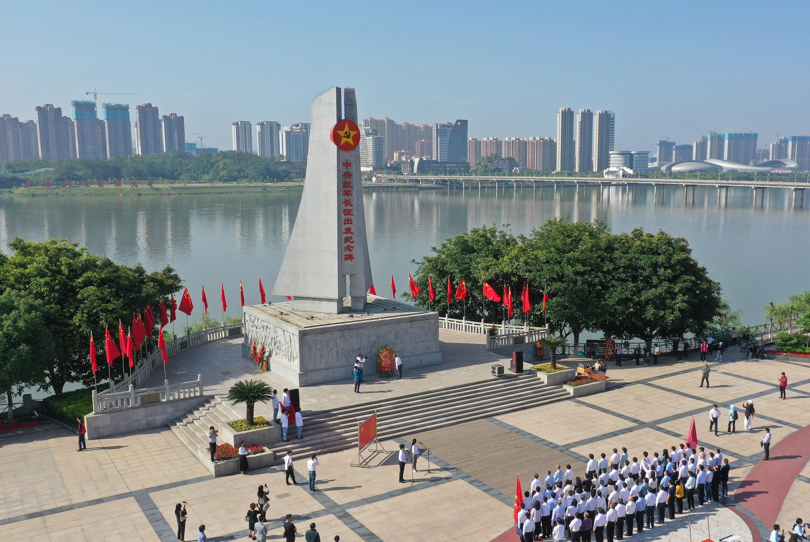 人們?cè)诮魇∮诙伎h中央紅軍長征出發(fā)紀(jì)念碑前參加紀(jì)念活動(dòng)(2021年4月30日攝,無人機(jī)照片)。新華社記者 萬象 攝