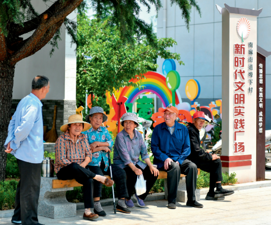 2022年6月15日,山東省沂源縣南麻街道埠下村村民在民生綜合體活動(dòng)廣場休息。自2021年以來,沂源縣建設(shè)多處以老年食堂、公共浴室、中心村衛(wèi)生室(便民藥店)、便民超市為主體,其他服務(wù)功能相補(bǔ)充的多位一體民生綜合體 朱崢攝 / 本刊