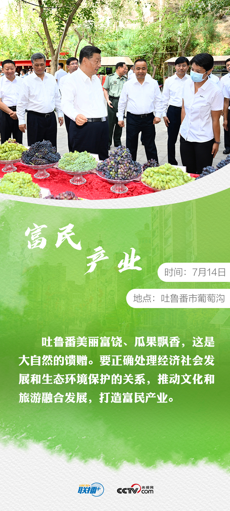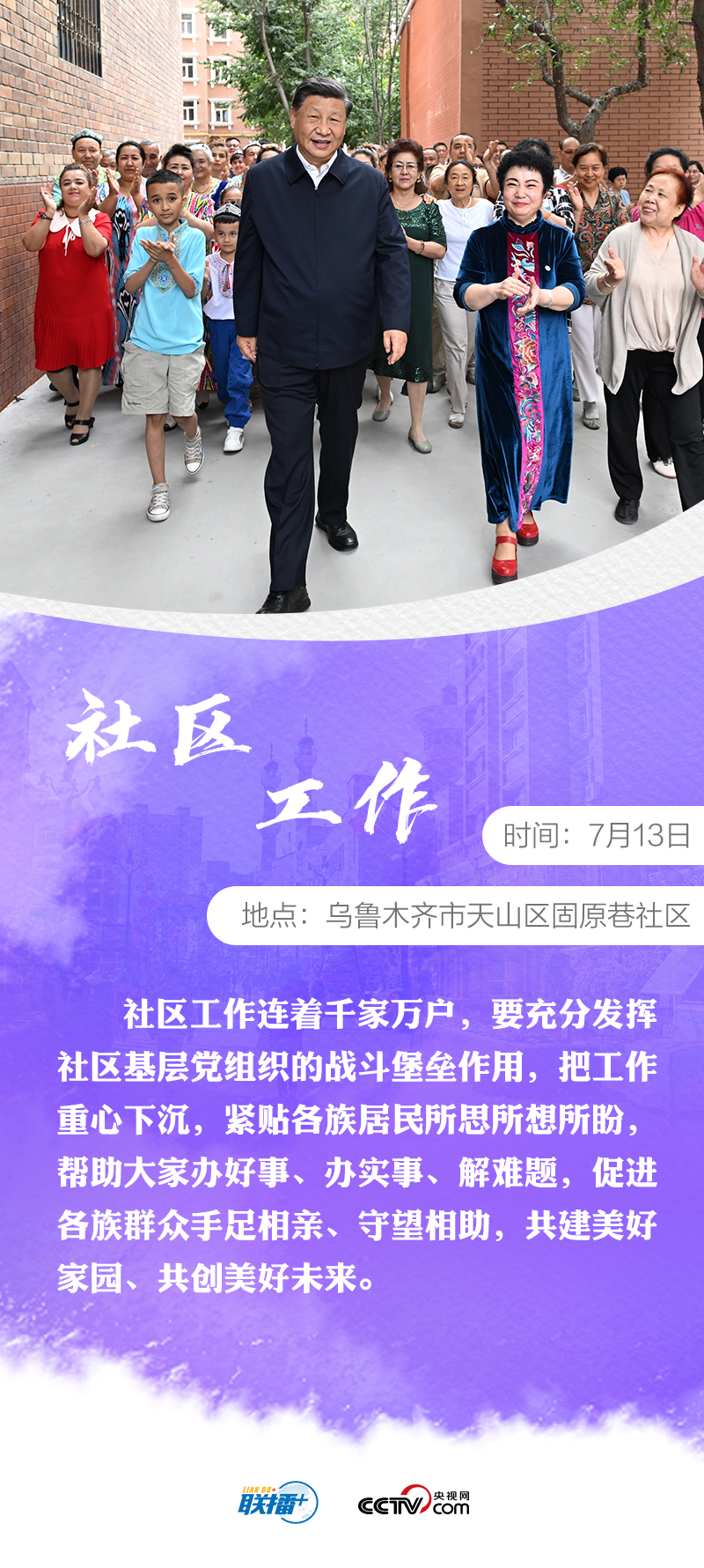 7月12日至15日,習(xí)近平總書記時(shí)隔八年再次考察新疆。他先后來(lái)到烏魯木齊、石河子、吐魯番等地,深入學(xué)校、國(guó)際陸港區(qū)、社區(qū)、博物館、農(nóng)村和新疆生產(chǎn)建設(shè)兵團(tuán)等進(jìn)行調(diào)研。
