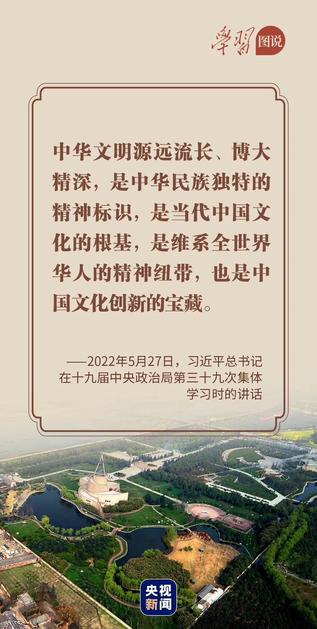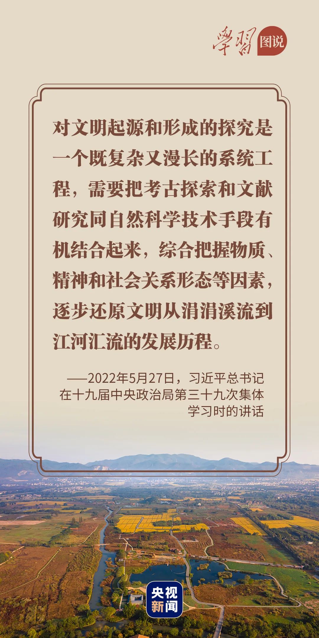 “深入了解中華文明五千多年發(fā)展史,推動(dòng)把中國(guó)文明歷史研究引向深入,推動(dòng)全黨全社會(huì)增強(qiáng)歷史自覺、堅(jiān)定文化自信,堅(jiān)定不移走中國(guó)特色社會(huì)主義道路,為全面建設(shè)社會(huì)主義現(xiàn)代化國(guó)家、實(shí)現(xiàn)中華民族偉大復(fù)興而團(tuán)結(jié)奮斗。”