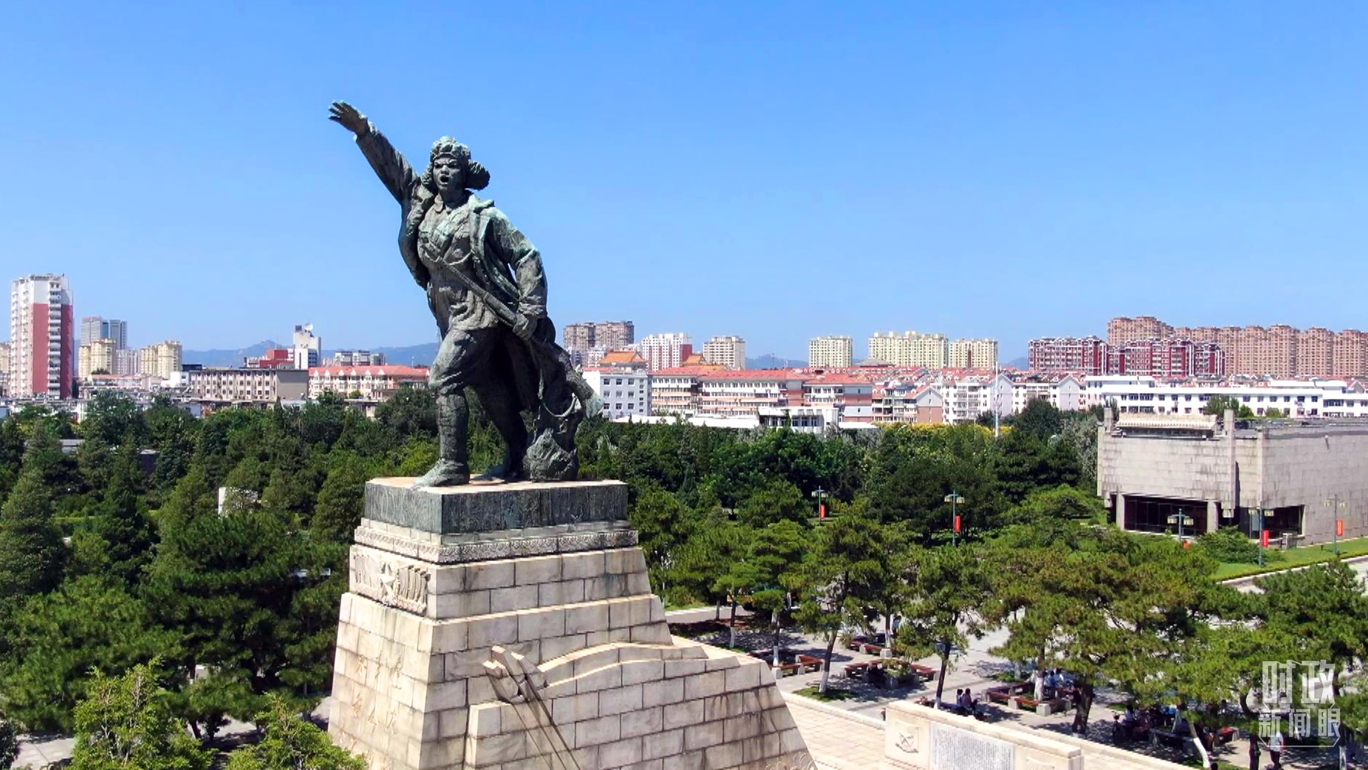 △遼沈戰(zhàn)役革命烈士紀(jì)念塔,塔身高8米,塔頂是一座持槍振臂吶喊的解放軍戰(zhàn)士全身塑像。(總臺央視記者范凱拍攝)
