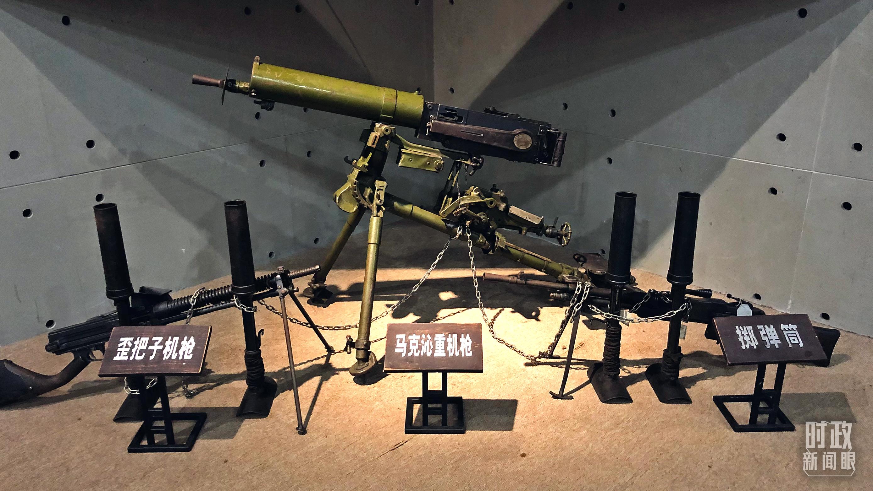 △遼沈戰(zhàn)役紀(jì)念館展出,歪把子機(jī)槍、馬克沁重機(jī)槍和擲彈筒。(總臺央視記者許永松拍攝)