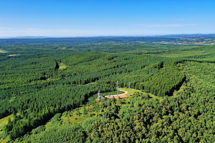 這是2021年8月23日拍攝的河北塞罕壩機械林場內(nèi)的望海樓(無人機照片)。三代塞罕壩林場人50多年堅持植樹造林,用汗水澆灌出綠波涌動的百萬畝人工林海。 新華社記者 牟宇 攝
