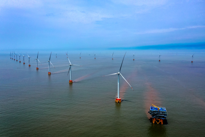 2021年5月16日拍攝的浙江舟山北部海域的中廣核岱山4號海上風(fēng)電場(無人機照片)。新華社發(fā)(姚峰 攝)