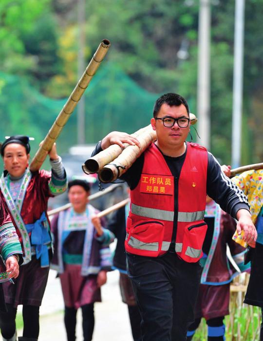 廣西柳州市融水苗族自治縣桿洞鄉(xiāng)黨鳩村脫貧攻堅(鄉(xiāng)村振興)工作隊員鄭昌昊和婦女們?nèi)趧樱?021 年 4 月 20 日攝)黃孝邦攝 / 本刊