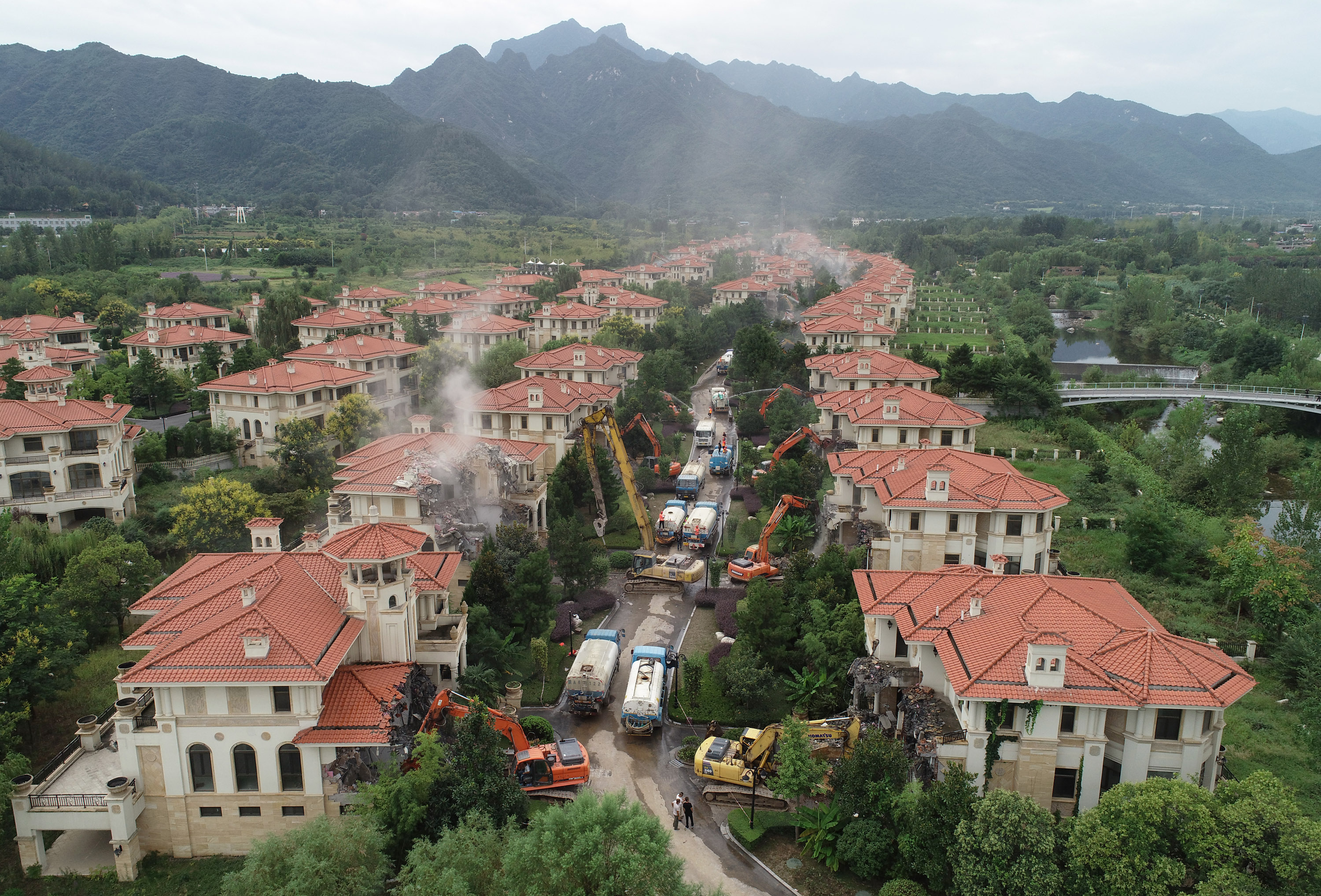 大型機(jī)械在陜西省西安市長安區(qū)秦嶺違建別墅群“群賢別業(yè)”內(nèi)進(jìn)行拆除工作(2018年9月6日攝,無人機(jī)照片)。新華社記者 邵瑞 攝
