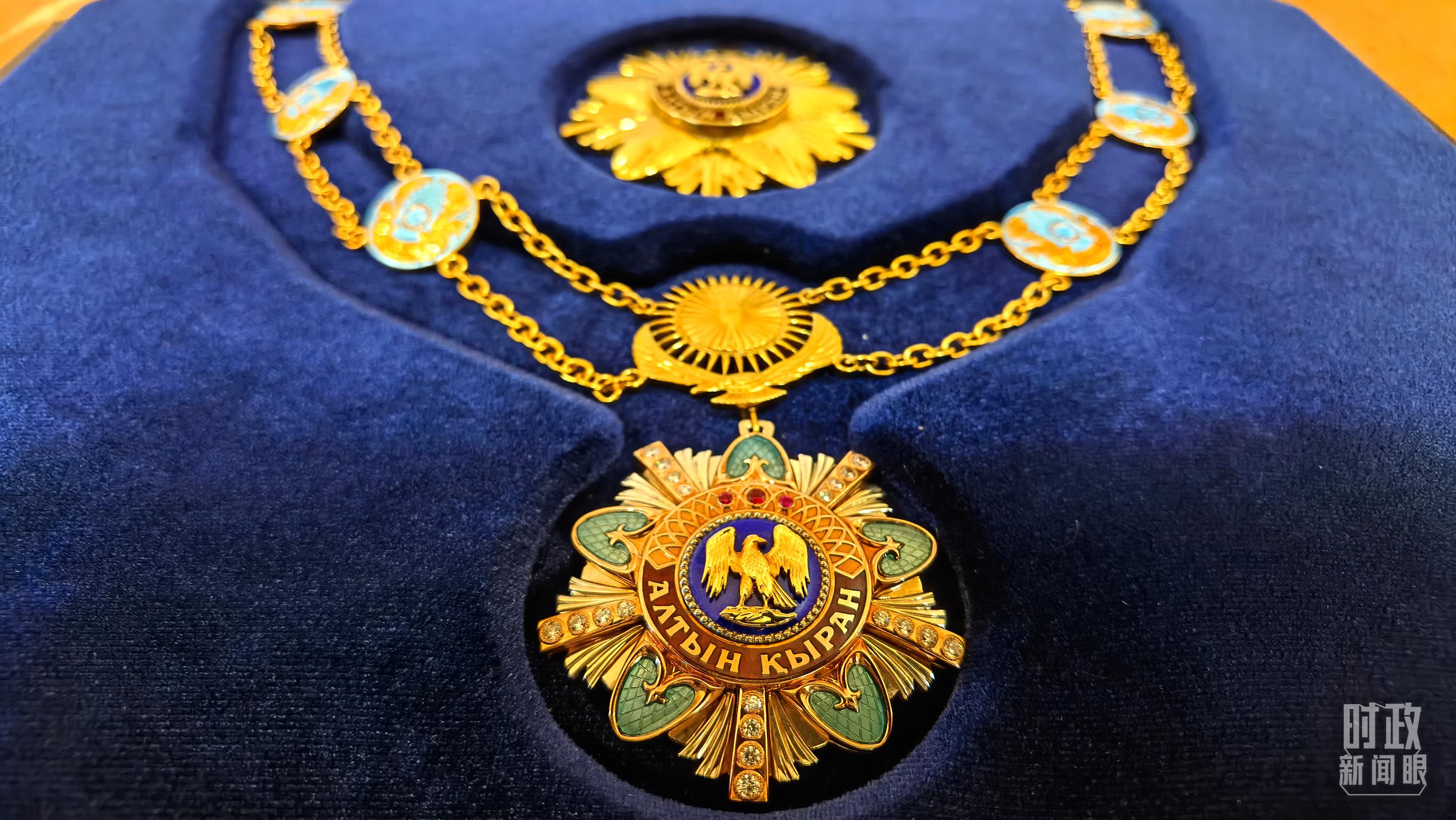 “金鷹”勛章設(shè)立于1995年,是哈薩克斯坦最高榮譽(yù),旨在表彰為哈薩克斯坦國家建設(shè)和對外友好關(guān)系作出重大貢獻(xiàn)的人士。“金鷹”勛章一套兩枚,分為領(lǐng)綬和襟綬,兩枚勛章的中央都是一只金色的雄鷹。