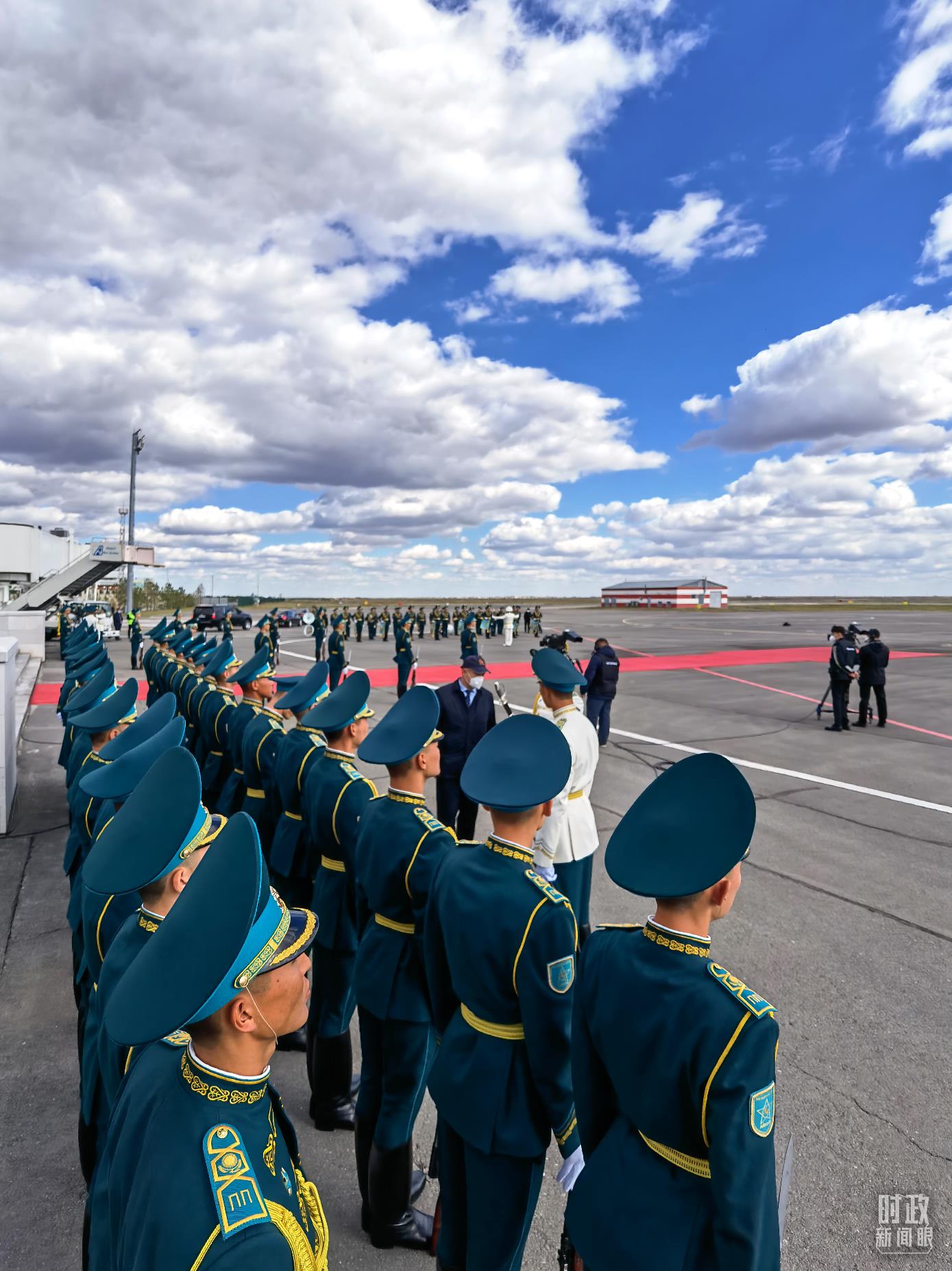 托卡耶夫總統(tǒng)親自前往機(jī)場迎接?,F(xiàn)場70余名禮兵分列兩側(cè)致敬,軍樂團(tuán)奏迎賓號角。