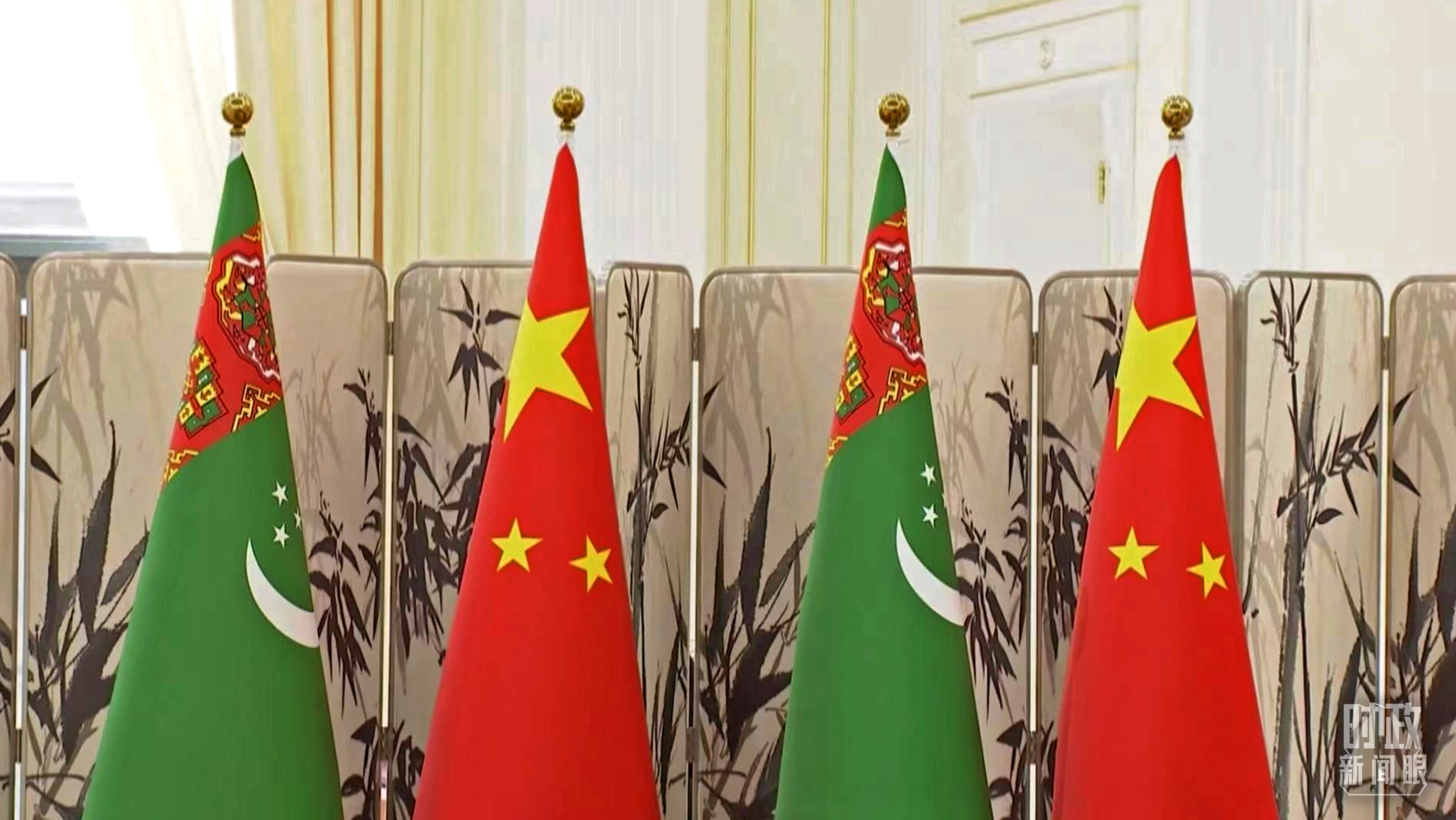 △中國、土庫曼斯坦兩國元首會見現(xiàn)場擺放的國旗。