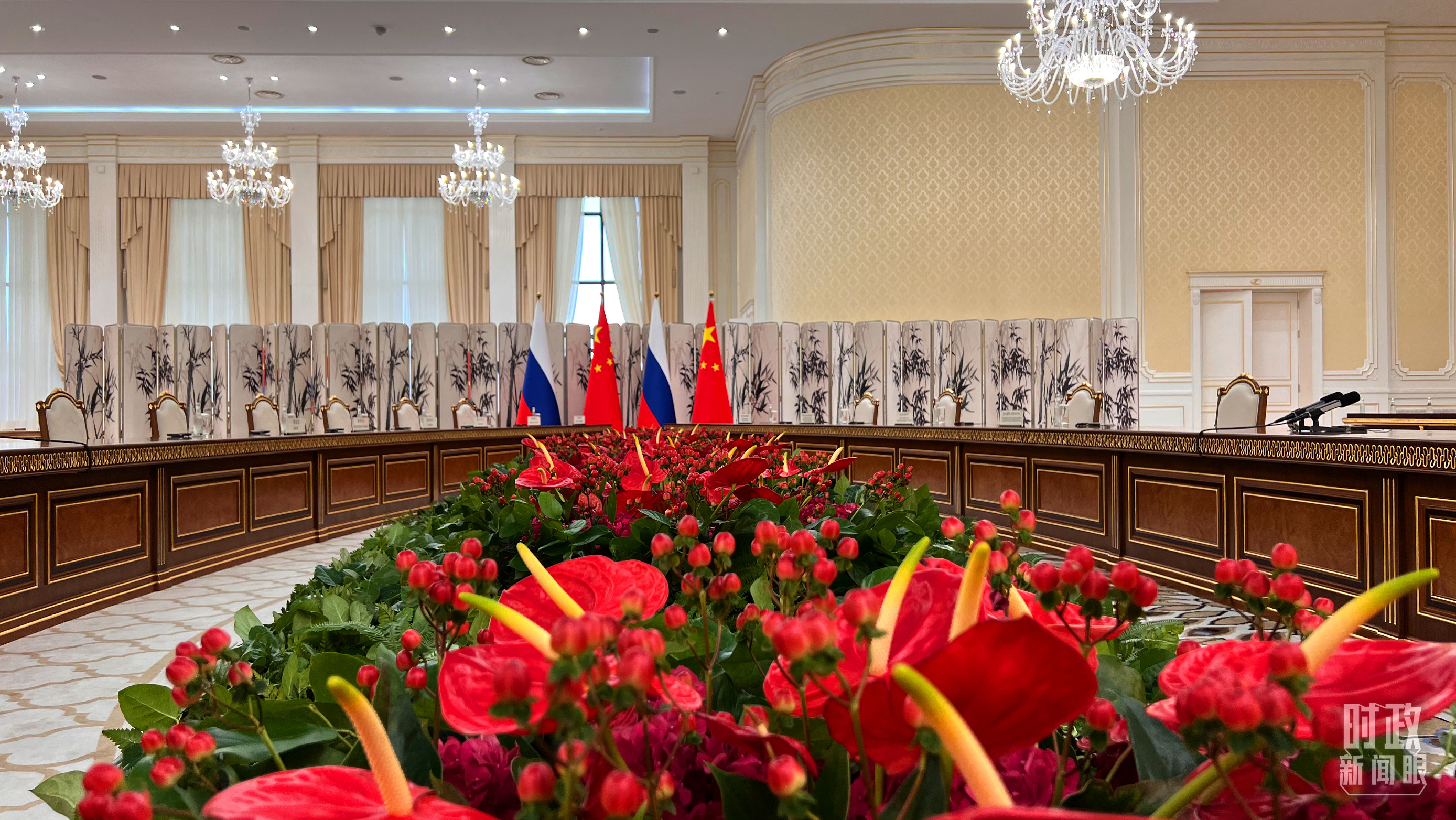 △中俄兩國元首會見現(xiàn)場擺放的兩國國旗。(總臺央視記者薛冠南拍攝)