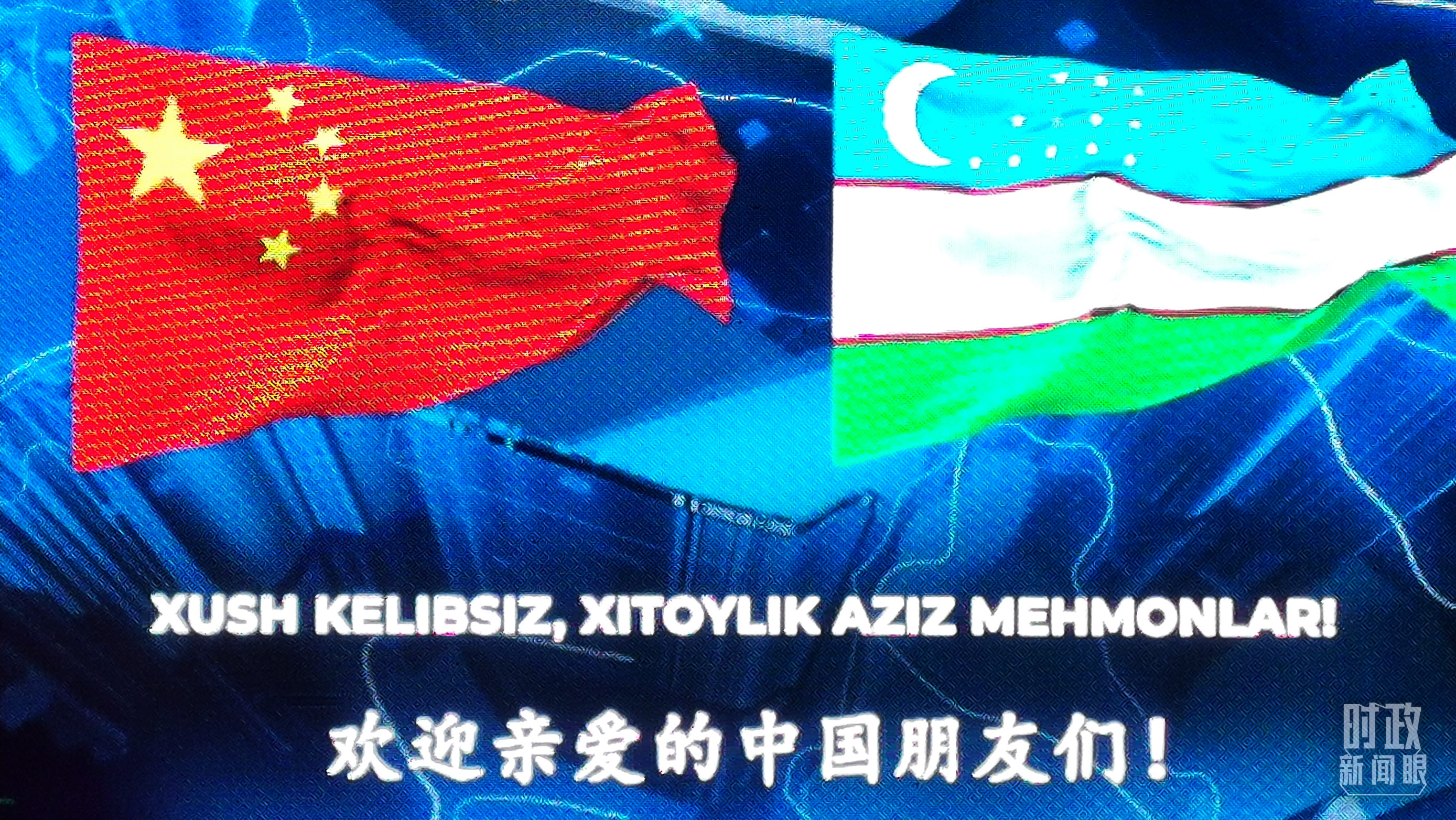 △在撒馬爾罕街道上,電子屏幕顯示中烏兩國國旗和中烏兩種語言的歡迎標(biāo)語。(總臺央視記者黃京輝拍攝)