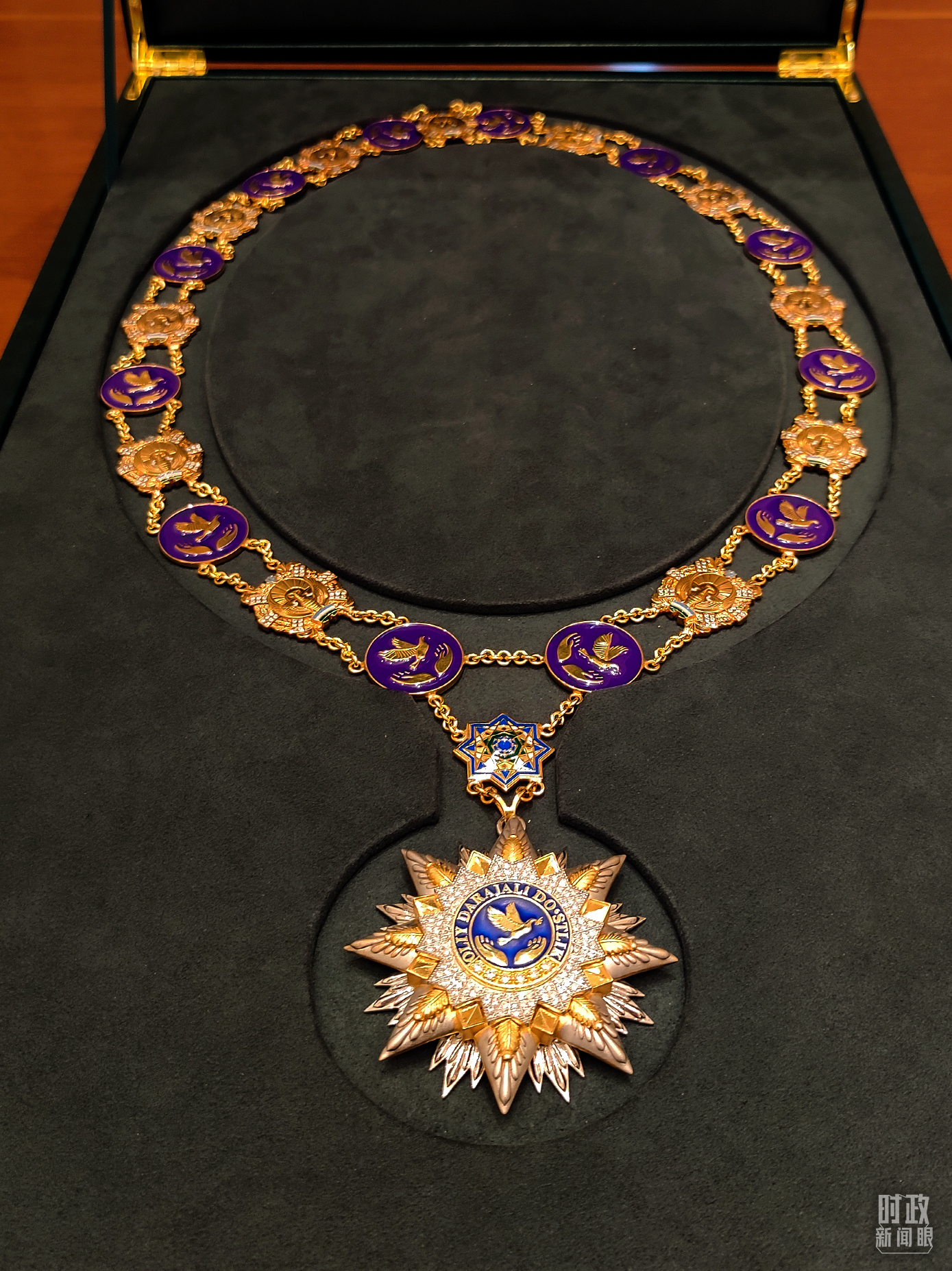 △“最高友誼”勛章章體分為4層,正中間是兩只手托舉和平鴿的圖案,象征友誼與和平,圖案外圍有烏茲別克語的“最高友誼”字樣。(總臺央視記者薛冠南拍攝)
