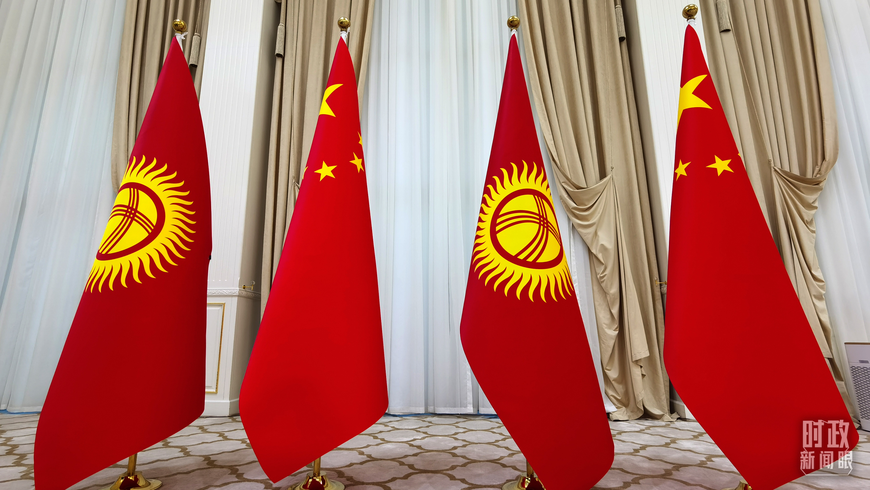 △中國、吉爾吉斯斯坦兩國元首會見現(xiàn)場擺放的國旗。(總臺央視記者曹亞星拍攝)
