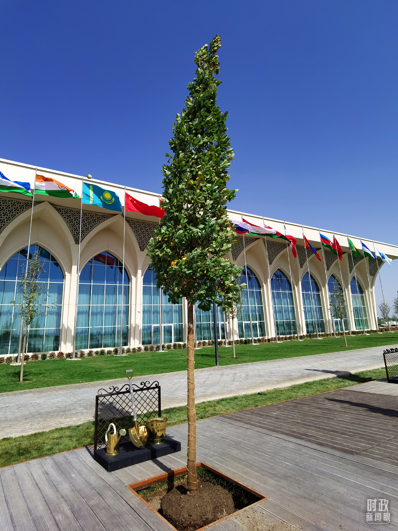 在國際會議中心北門外廣場,米爾濟(jì)約耶夫總統(tǒng)邀請習(xí)主席共同種下一棵橡樹,并一起培土、澆水。