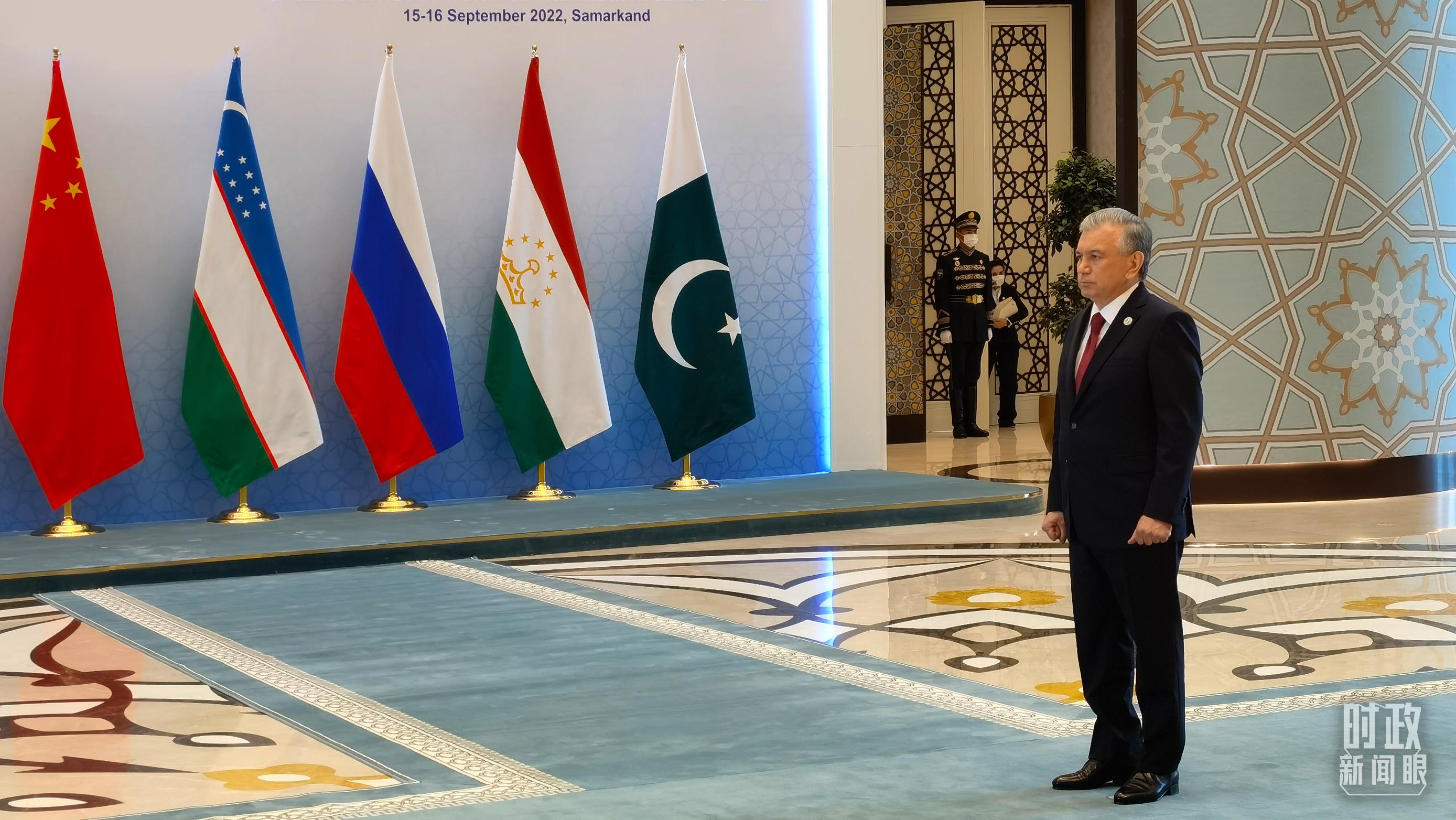 當天上午,烏茲別克斯坦總統(tǒng)米爾濟約耶夫作為主席國元首提前來到現(xiàn)場,準備迎接各國領導人的到來。