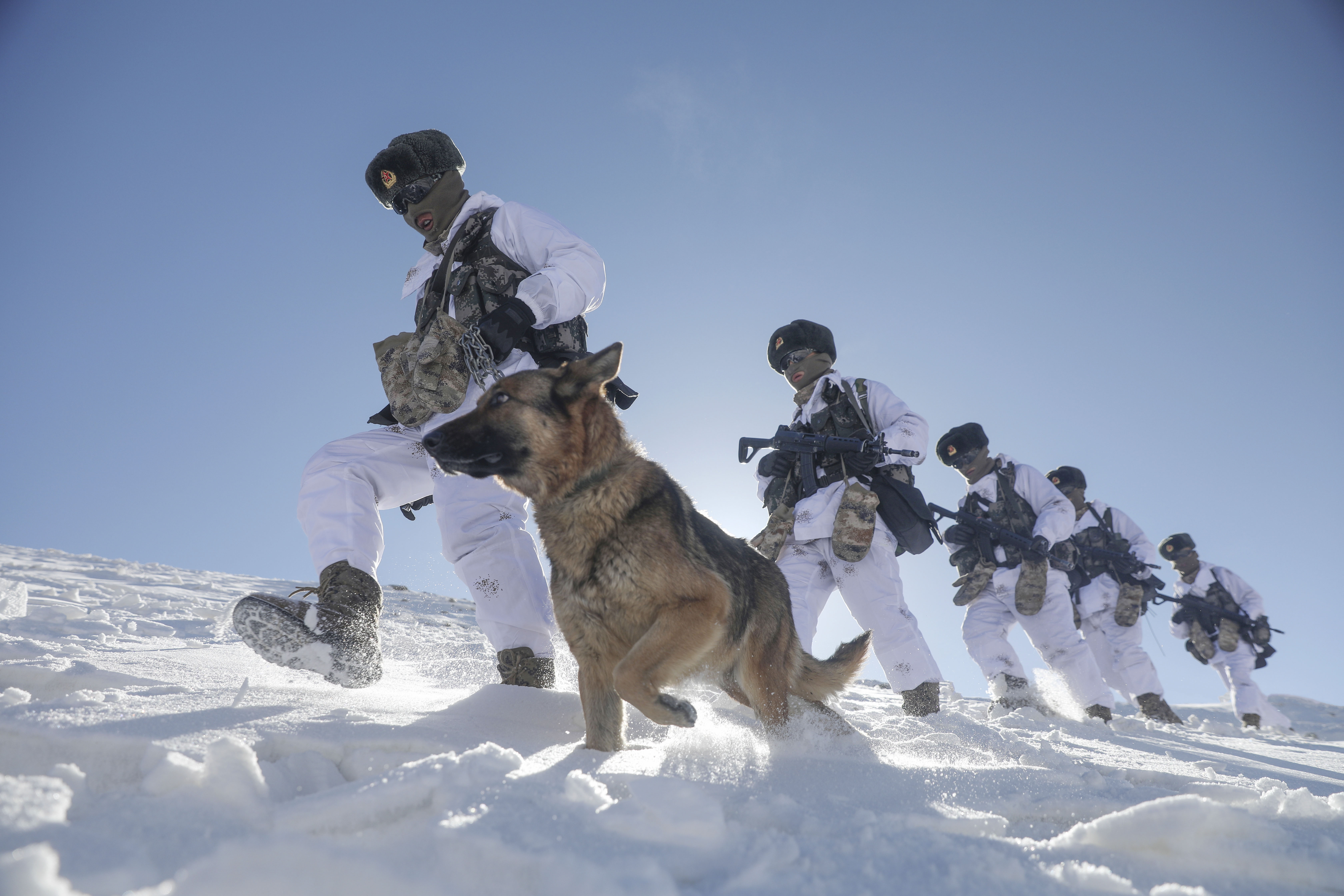 駐守帕米爾高原的新疆喀什軍分區(qū)某邊防團托克滿蘇邊防連官兵按計劃對海拔5100米的山口實施例行巡邏(2021年2月11日攝)。新華社發(fā)(姬文志 攝)