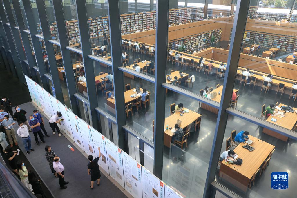在北京國家圖書館,工作人員在介紹“經(jīng)典,予生活以詩意——‘文津經(jīng)典誦讀’十周年主題展”(2022年9月7日攝)。新華社記者 殷剛 攝