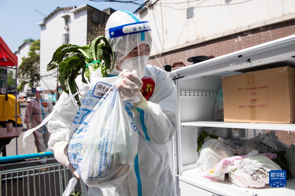 在湖南省長(zhǎng)沙市雨花區(qū)東塘街道楓樹(shù)山社區(qū),志愿者把生活物資放進(jìn)無(wú)人車,助力解決物資配送“最后一公里”問(wèn)題(2022年4月7日攝)。新華社記者 陳思汗 攝
