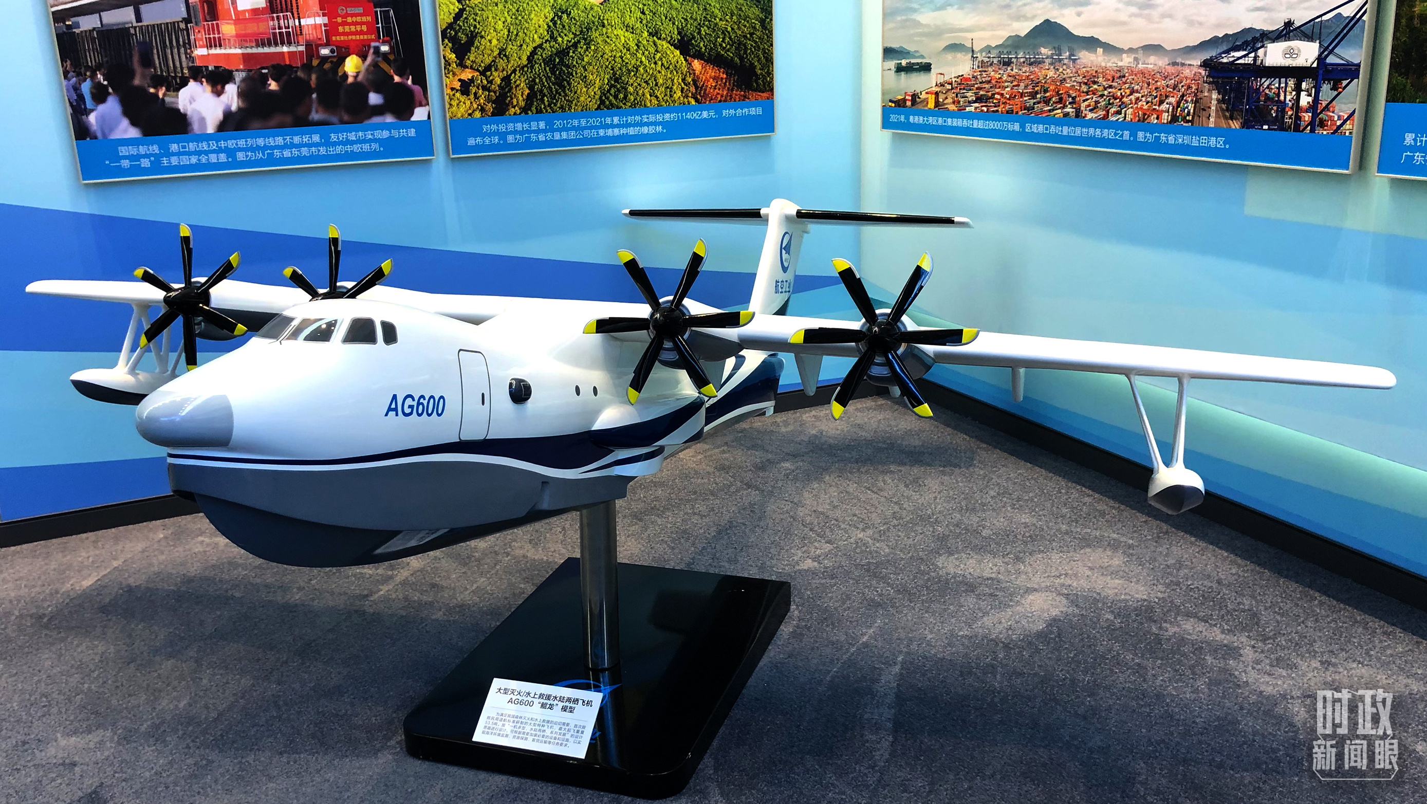 △ 大型滅火/水上救援水陸兩棲飛機AG600“鯤龍”模型。(總臺央視記者許永松拍攝)