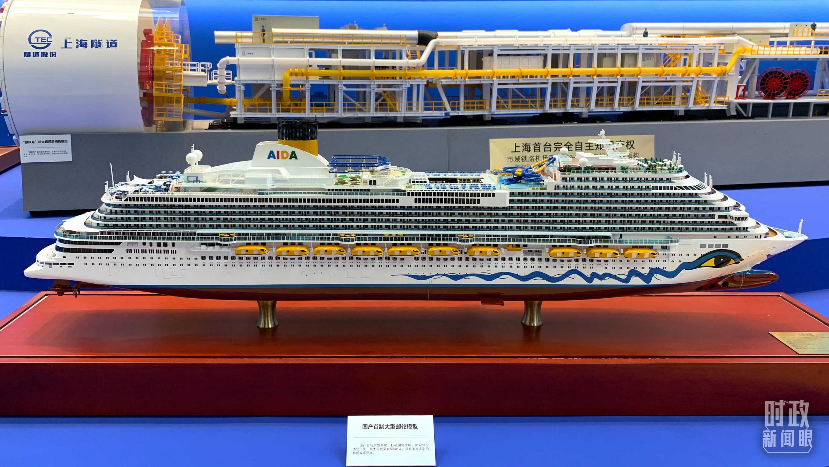 △ 國產首制大型郵輪模型。郵輪總長323.6米,最大可載乘客5246人。(總臺央視記者韓銳拍攝)