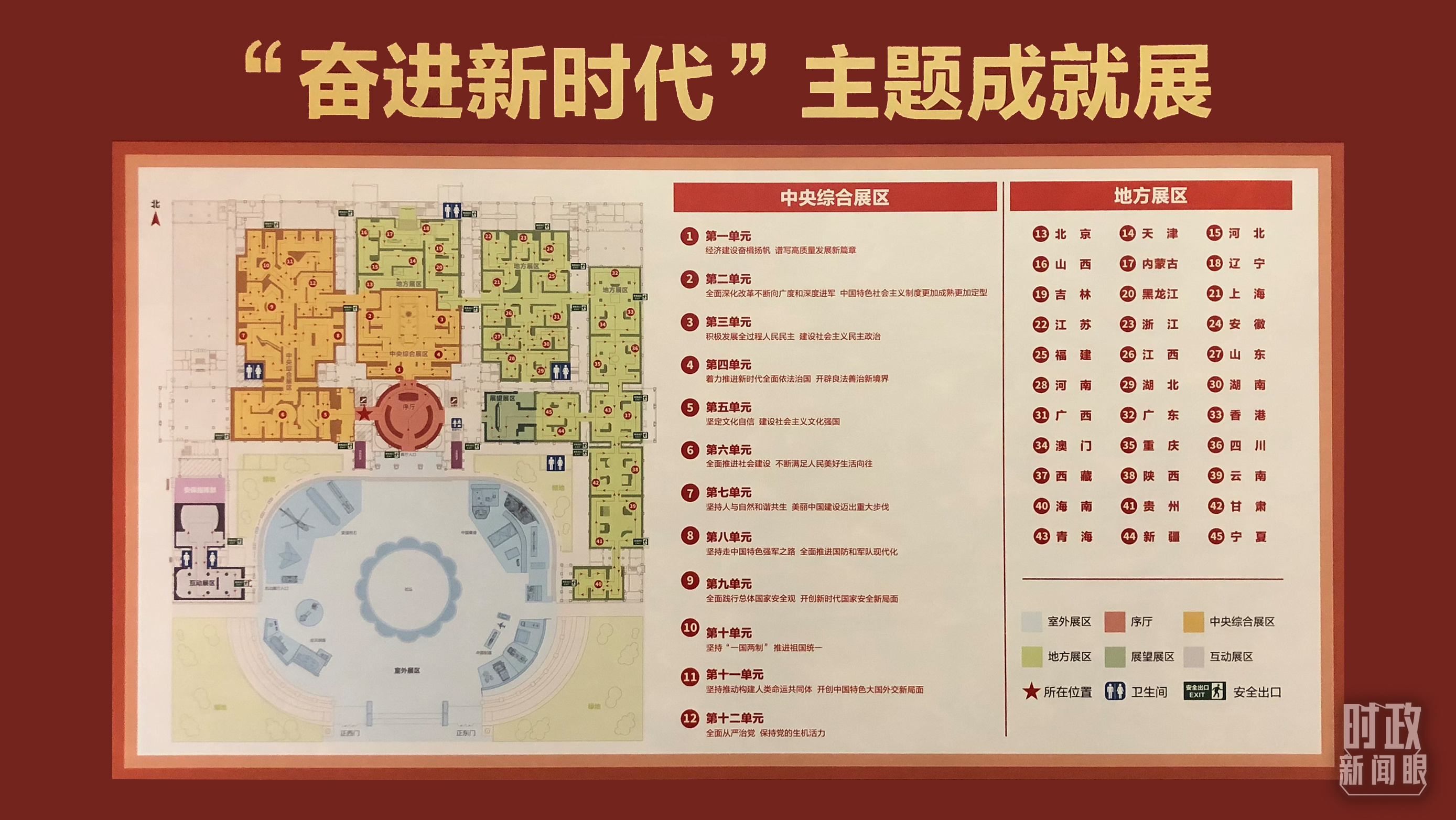 “奮進新時代”主題成就展設序廳、中央綜合展區(qū)、地方展區(qū)、展望展區(qū)、室外展區(qū)和互動展區(qū)6個展區(qū),面積超過3萬平方米,運用圖片、實物、模型等6000多項展覽要素。