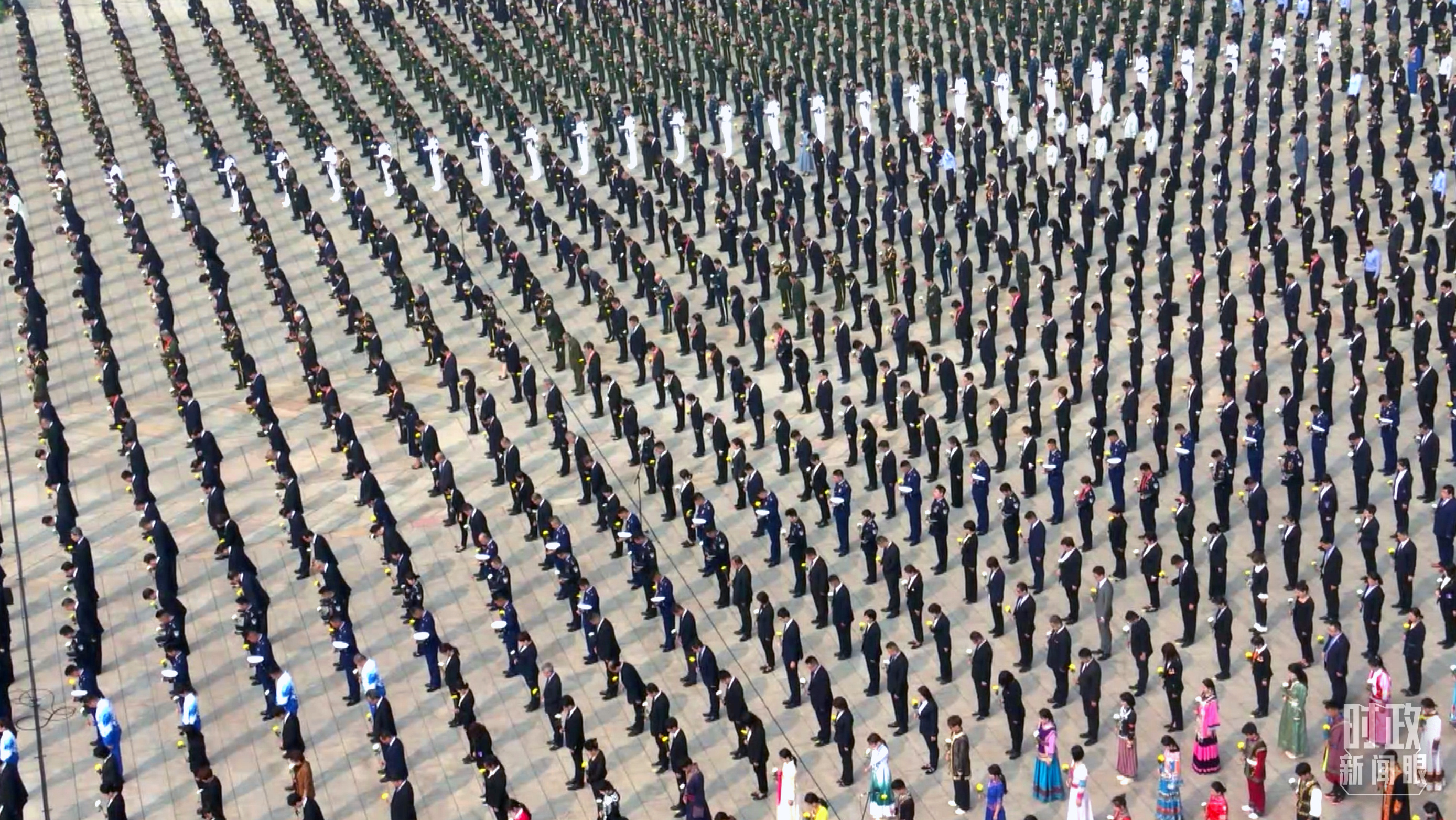 △敬獻(xiàn)花籃儀式的默哀環(huán)節(jié)。